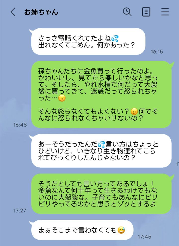 家には水槽など金魚が泳げるような容器もなければ餌もなく…、急遽夫が買いに行きました。その際に義母から「孫に見せたかっただけ。2、3日生きればいいんだよ。そんなに大袈裟に買ってこなくてもいい」、と言われました。