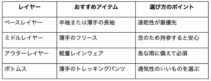 夏の登山の服装は、暑さ対策と汗冷え防止を両立させることが重要です。