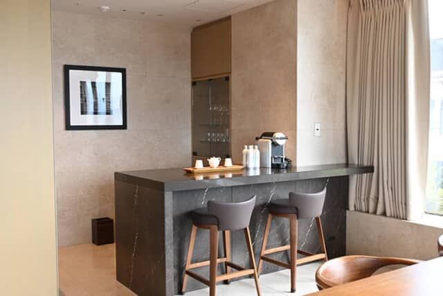 リビングの一角にあるダイニングエリアは、客室の他の雰囲気とは異なりスタイリッシュでモダン。かつ機能的なデザインです。