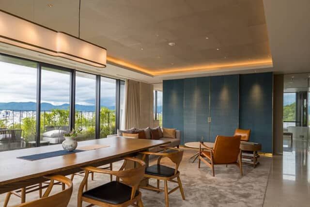 昭和8年(1933年)竣工の元清水小学校を改修した【ザ・ホテル青龍 京都清水】。教室を改装した客室や、増築部分の客室はもちろん、スイートルームや八坂の塔を間近に見られるテラス付きの客室など、多彩な間取りのゲストルームを用意。ここでは京都の眺望が素晴らしい137平米の「パノラミックスイート」を紹介します。