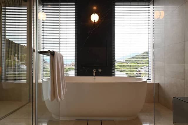 大きな据え置きタイプのバスタブが左右対称に置かれたスタイリッシュなバスルーム。シャワージェルとシャンプー、コンディショナーは、スペイン・バルセロナの高級スパブランド「ナチュラ ビッセ」をそろえます。檜の香りのバスソルトも用意され、爽やかな香りとともにバスタイムを楽しめます。
