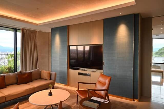 増築棟にある「パノラミックスイート」は京都のパノラマビューを満喫できるシグネチャースイートです。東山の高台からの眺望は素晴らしく、南は京都駅周辺から北の山々まで見渡せるほか、すぐ目の前には清水のランドマークとして有名な八坂の塔が立っています。室内はリビングダイニングとベッドルーム、広いバスルームを備えます。
