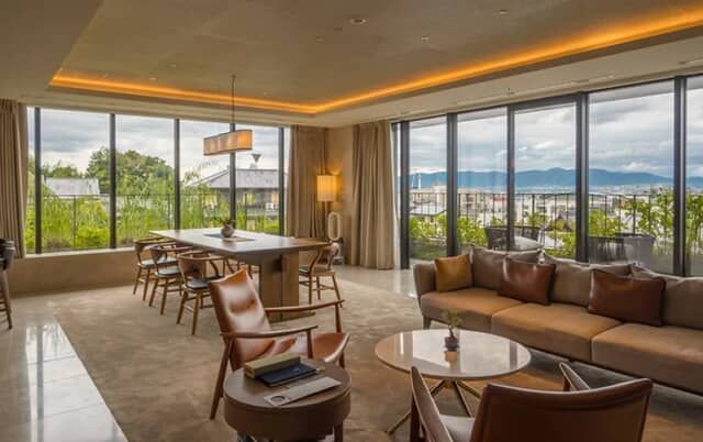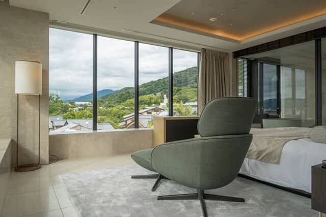 解放感抜群の客室は南と西に向いた大きな窓に囲まれ、室内どこからでも景色を楽しめます。遠くには京都タワーも見えました。大きなソファのほかに、ビンテージ感のある上質なリビングチェアが置かれます。