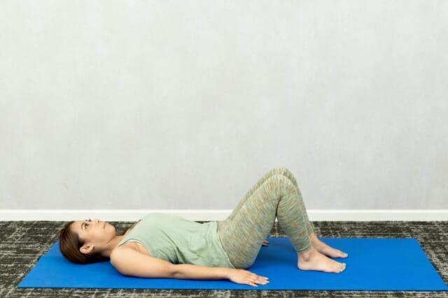 (1)仰向けになり、ひざを45度くらいに曲げて骨盤を真っ直ぐ立てた状態になり、手にひらを下に置く