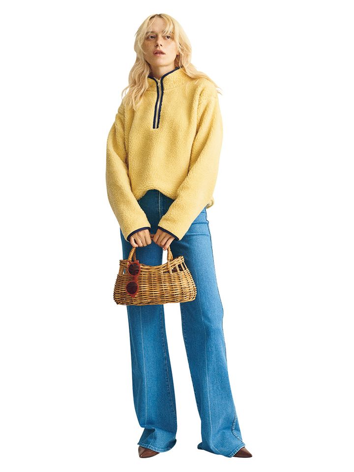 合わせるボトムに悩まなくていい、ショート丈のフリース。ウールを混ぜたボア素材により、キレイな色がほどよくマットな質感に。おかげで、フレッシュなイメージのイエローも落ち着いた色みに着地。ハーフジップのえり元とそでに配した配色テープが、膨張感なく使える秘訣。