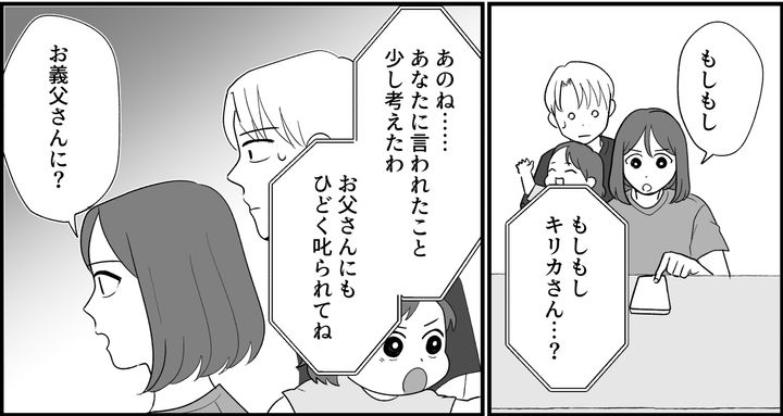 「あれから、母さんから連絡あった? きっと怒ってるよ……」と、心配するソウタ。義母みたいな人にははっきり言わないとわからないのだからあれくらい言って当然です。そんな話をしていると、またもや義母から着信が。私はソウタに目くばせをしてから、電話に出ました。