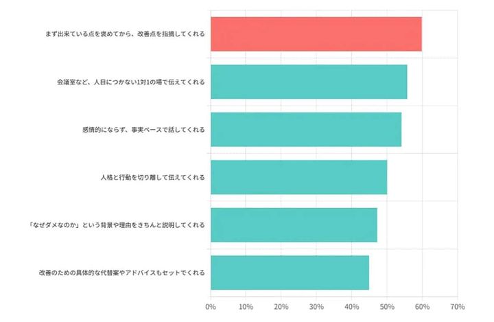 また、半数を占めた「人格と行動を切り離して伝えてくれる」は、Z世代が求めるフィードバックの本質を示しており、上司の伝え方次第では「人格否定」と受け取られるリスクがあることがわかります。