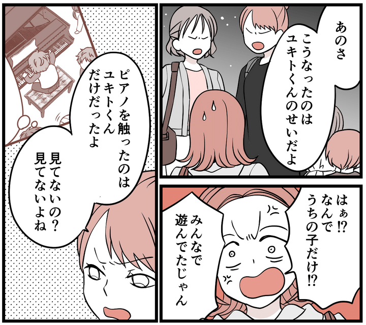 まわりの保護者に相談してみたところ、予想外の反応が返ってきました。ユキトが原因だと言われ、ピアノを触って遊んでいたのは、うちの子どもだけだと言われてしまいました。さらに、「その場で注意しないし、家でも言い聞かせていないのでは?」と言われてしまい、ショックを受けました。