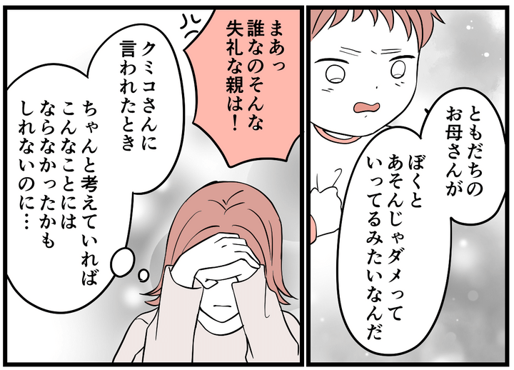 義妹のクミコさんに「子どもを放置しすぎ」と言われましたが、ママ友たちにも同じことを指摘されてしまいました。私が……おかしかったのでしょうか……。みんなは子どもをもっとそばに置いて見守っていたのでしょうか……。