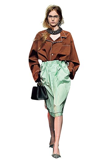 (高木さん) チョコミント配色をハンサムな開襟シャツで解釈したPRADA。「スポーティなナイロン素材の上下をトラッドに着る意外性に惹かれました」(高木さん) (船戸さん) ブラウンは単体で見るとレトロな要素がきわ立ちますが、甘い色とうまく調和したり、いろいろな素材を組み合わせたときまとまりのあるワントーンをつくれたりと、何かと都合のいい、バランサー的な側面のある色だなと感じます。