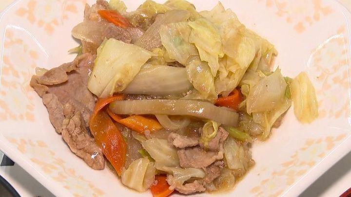 切っても切ってもまだ大きいキャベツをダイナミックに炒めて完成したのは「豚肉とキャベツのオイスター炒め」です。