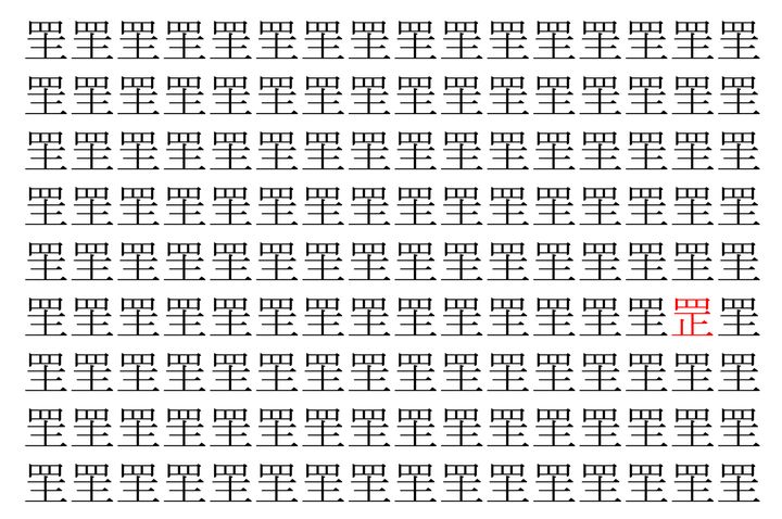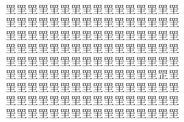 画像に並んだたくさんの「罜」という漢字。 その数144個なのですが・・・、実はその中に1つ違う漢字が紛れ込んでいます!!