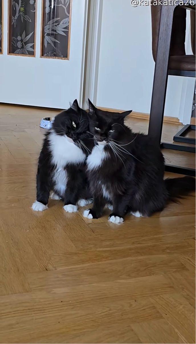 今日も飼い主さんの前で仲良く寄り添うネコの兄弟たち。 頭を寄せ合い、ぴったりと密着する姿からは、お互いへの愛情がひしひしと伝わってきます。
