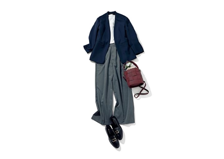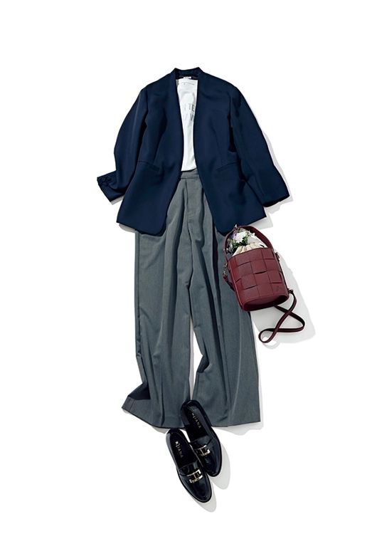 ジャケット¥34,100/ドレスレイブ(ジオン商事) ロゴTシャツ¥3,498/ロペピクニック(ジュン) グレータックパンツ¥12,980/ギャレスト(ワールド) ローファー¥18,150/ダイアナ(ダイアナ 銀座本店) バケツバッグ¥6,996/デッサン(ワールド)