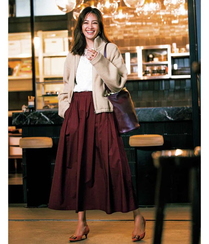 心浮き立つ夜の女子会はリッチな素材のブルゾンで華やぎを。気取らないムードがレースブラウス×フレアスカートの甘さをほどよくやわらげ、更新感もUP。寒暖差でコーデに悩みがちなこの時期、カーデ以上コート未満のきれいめウールブルゾンは活躍度大!