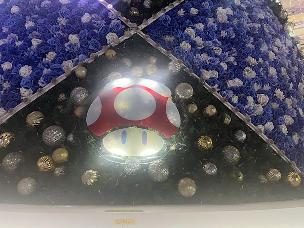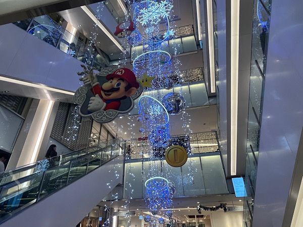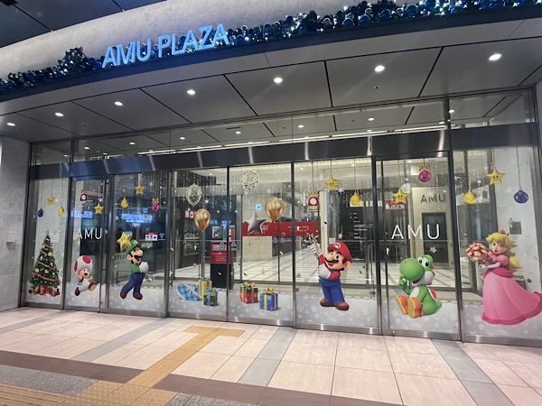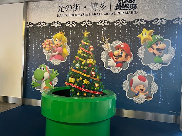 博多駅構内にもたくさんの場所で「スーパーマリオ」のキャラクターたちが出迎えてくれます。こちらはJR博多シティ/アミュプラザ博多1階入り口。ホリデーシーズンを彩る賑やかで煌びやかなフォトスポットです。