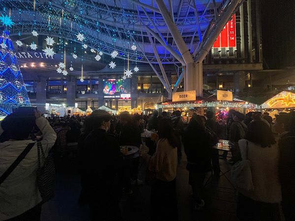 会場へ早めに到着しても時間が足りず、あっという間に点灯式の時間が迫ってきました。今夜のゲストはマリオとルイージということで、博多駅一帯はとんでもない数の人々で賑わっていました。