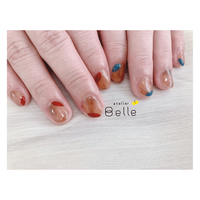 【カラーニュアンスネイル】キャメルブラウンが映える!レッドとブルーがポイント