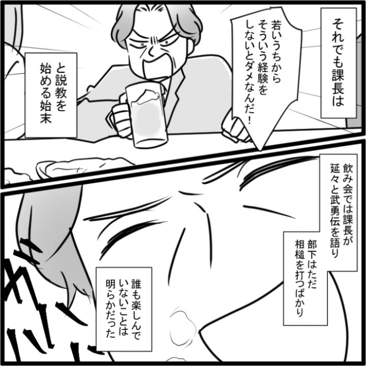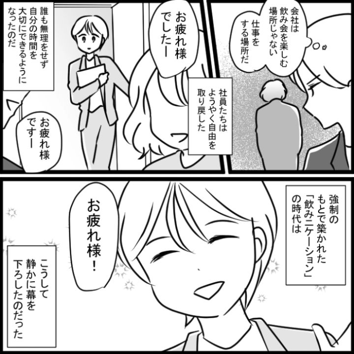 強制参加の飲み会は部長が異動してきたことで終了。部署に平和が訪れたのでした。