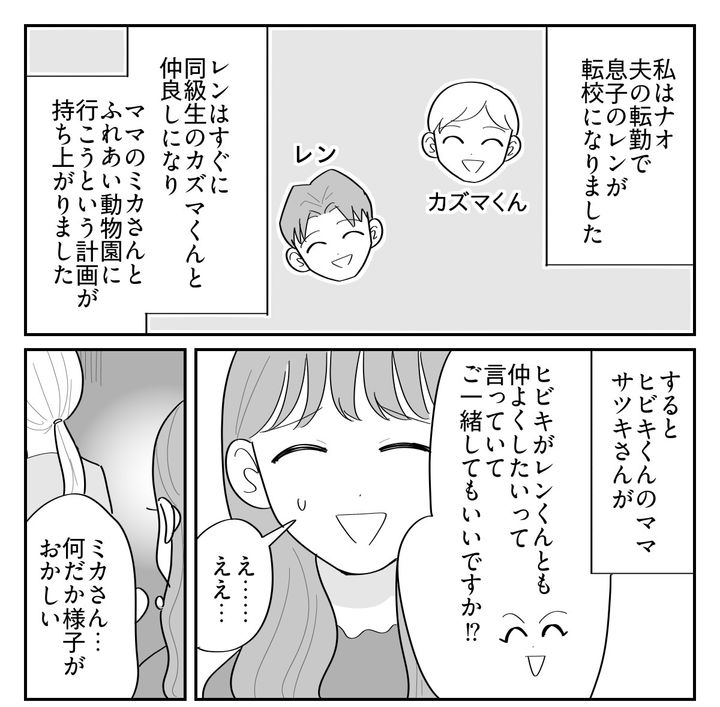 私はナオです。夫の転勤で息子のレン(小2)が転校になりました。知らない土地ではじめはとても不安でしたが、レンはすぐにカズマくんと友達になったようです。カズマくんのママ・ミカさんもとても優しい人で、母子2組でふれあい動物園に行こうという計画が持ちあがりました。そこへヒビキくんのママ・サツキさんが声をかけてきて、3組で一緒に行くことになりました。ありがたい話だと思っていたのですが……なんだか様子がおかしいです。