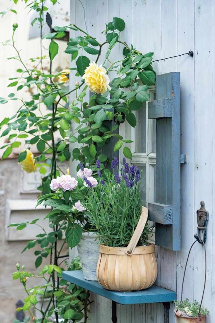 バラ‘グラハム トーマス’を誘引し、ラベンダーの鉢植えを並べて全体的にパステルカラーの雰囲気にまとまりよくおさめています。