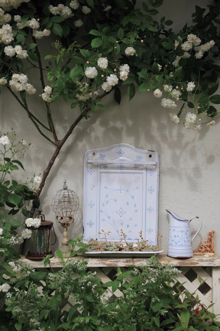 壁に背の低いフェンスを立てかけ、白い壁の前にはアンティーク雑貨を飾ってギャラリー風の仕立てに。