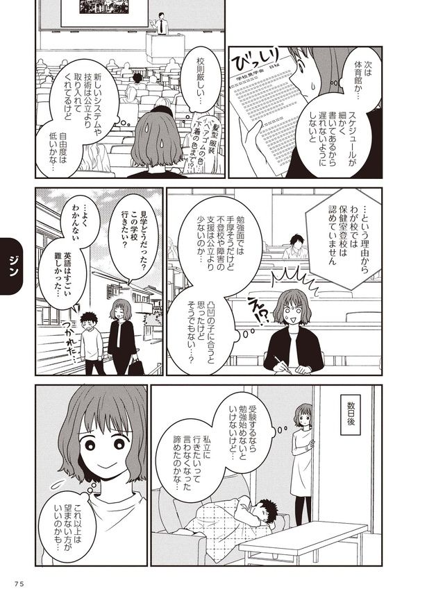 「生きづらいと思ったら親子で発達障害でした」の著者モンズースー氏。子どもが過ごす居場所の選択肢は多いほど良いと考えた彼女が、発達に偏りのある子の進路に悩んでいる家庭や情報を探している方の力になればと、選択肢の一つとして受験を経験した4つの家庭に取材し、実録コミック『発達障害っ子の中学受験』にまとめました。「受験を決意した理由」「塾や学校選び」「勉強の工夫」「病院や薬との付き合い方」「合否を迎える瞬間」「入学後に感じたこと」――各テーマを通して、壁にぶつかりながらも家族が大切にした思いや選択が浮かび上がります。