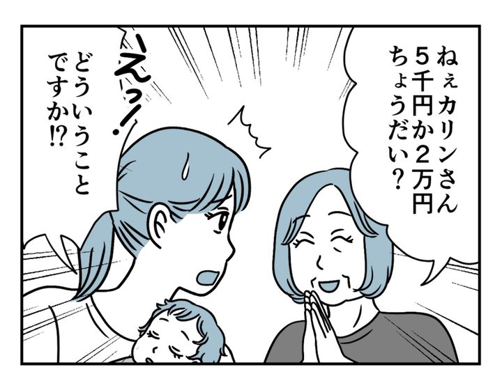 カリンさんは現在、初めての育児に奮闘中。夫のセイジさんが転職したばかりで収入が不安定のため、しばらく義実家で同居することになりました。しかしカリンさんは義母の「見栄っ張り」な部分に困っていました。ある日「町内会費を払って」と言われたカリンさん。同居しているのに2軒分で申し込んだと言われ、とても納得ができません。義母からのお金の要求はさらに続き……。