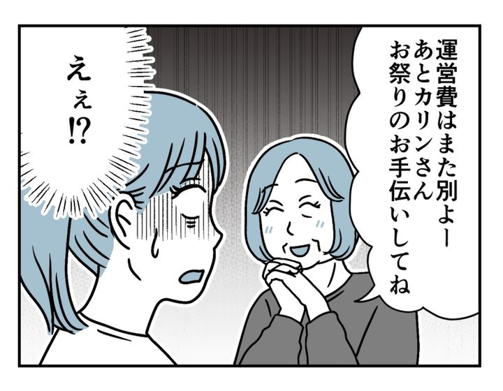 お義母さんが請求してきたのは、地域のお祭りの運営費でした。金額に応じた提灯に名前を書かれて飾られるので、どの家がいくら出したのか丸分かりなのだそうです。しかも当然のようにお手伝いも頼まれて……。お義母さんにとっては毎年している普通のことなのかもしれませんが、カリンさんからすれば驚きの連続ですね。