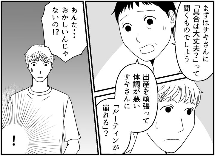 私はサキ。夫のタカシと結婚して娘のユリ(3才)がいます。先日息子のレントも生まれ、無事退院して数日が経ったところです。しかし夫は「ルーティン人間」。自分の生活ルーティンが最優先で、それを乱されることをなにより嫌います。私が里帰り出産したいと言っても拒否し、うちの親の手伝いも嫌がり、陣痛が来ている妻に付き添おうともせず……。そんななか体調が良くなかった私は、子どもたちを義母に任せて久しぶりに数時間ゆっくり眠りました。