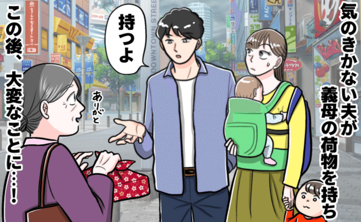 夫は気が利くタイプではなく、家族で外出するときは私が長男と手をつなぎ、次男を抱っこ、またはバギーに乗せて押していました。そして夫は手ぶらでひとり歩きのようにさっさと先を行く、ということが日常茶飯事。しかし、そんな夫が何を思ったのか、義母が持っている荷物を持つと言い出して……。