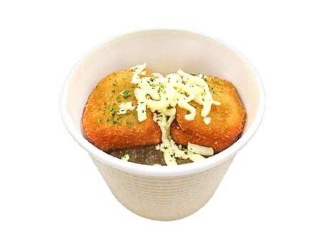 白身魚と海老のすり身をサンドして揚げたトーストとチーズ、パセリをトッピングしたオニオンスープです。
