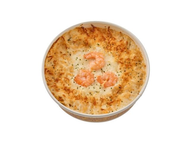 原材料価格等高騰により、推奨売価(税抜)460円から480円に変更。クリーミーなホワイトソースに海老をのせたグラタンです。