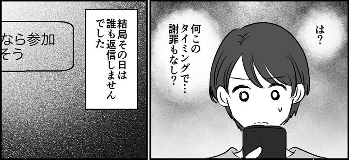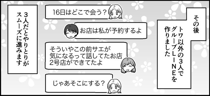 結局トワから応答はないまま。私たち3人だけの都合で日にちを決め、お店の予約まで完了しました。「当日楽しみだね~!」と盛り上がっていたところに4人のグループトークのほうにトワからメッセージがありました。「17日なら参加できそう」
