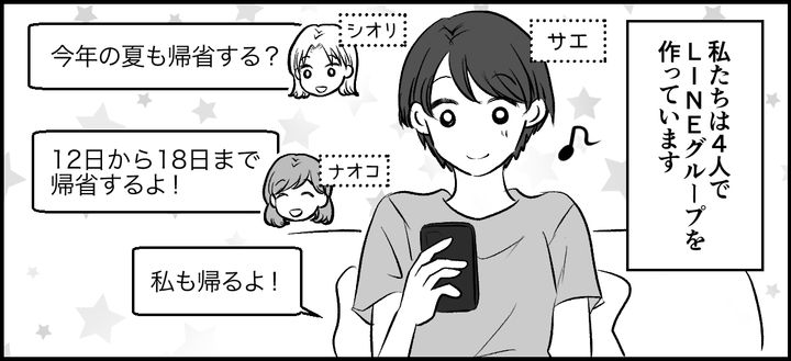 私は大学進学を機に上京し、現在も東京に住んでいます。今でも高校時代から仲のいい友人シオリ、ナオコ、トワとは毎年夏の帰省時に会っています。今年も夏の帰省に合わせて4人で集まる話を進めましたが、トワはずっと既読スルーしたまま。最終的に私、シオリ、ナオコの3人で16日に決定し、お店の予約も済ませました。