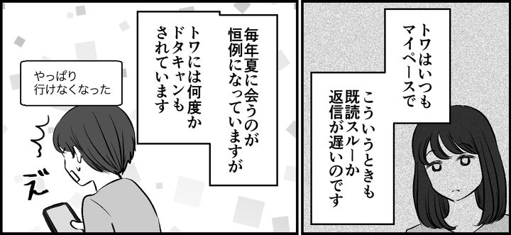 トワは出会った頃からマイペースな子で、一時期は「不思議ちゃん」と呼ばれていました。こうしたやりとりでは、いつも既読スルーをするか、返信が遅いのです。毎年夏に会うのが恒例とはいえ、トワには何度かドタキャンもされています。
