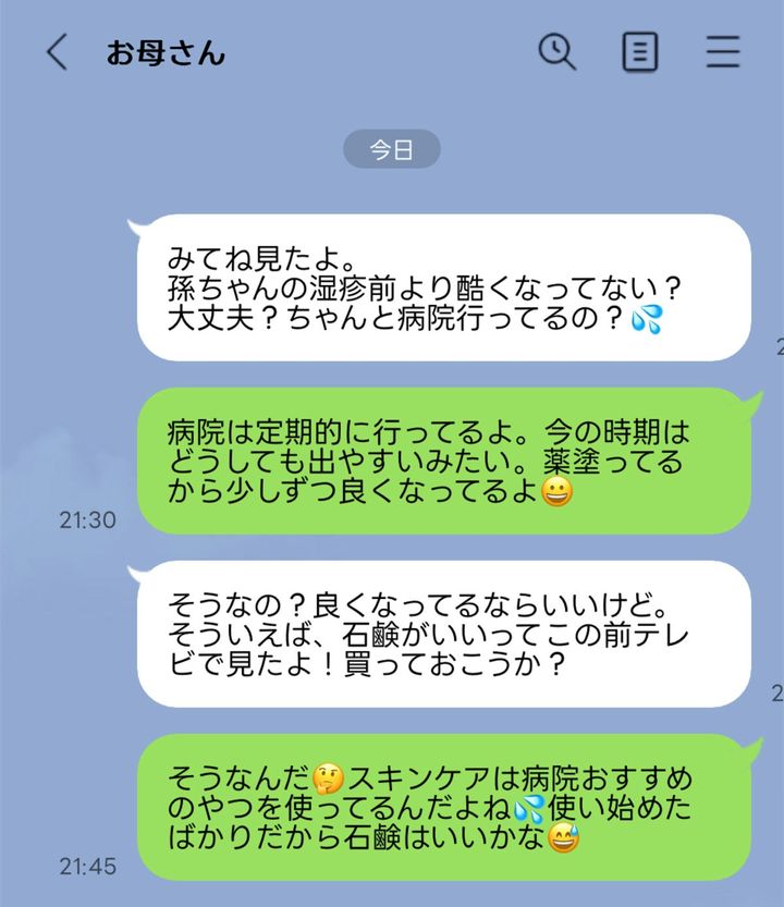 湿疹についてはきちんと病院にも定期的に通っているので「大丈夫だよ」と伝えているのですが、「○○したほうがいいよ」など、自分の育児論を押し付けてくるのが本当にしんどいです。