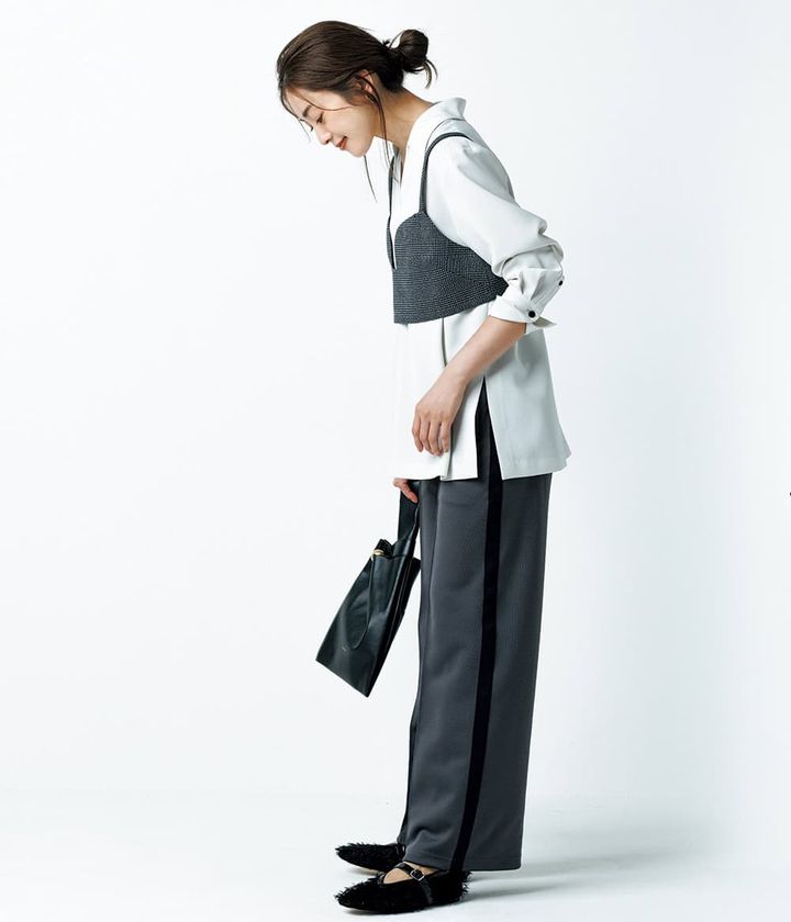 ビスチェ×シャツ[セット販売]¥59,400(アドーア)パンツ¥29,700(アストラット/アストラット 新宿店)バッグ¥42,900(オルセット/オルサ)パンプス¥45,100(ヒューン/クルーズ ショールーム)キャップ¥4,620(ニューエラ)ピアス¥14,740(エムシー・スタジオ/ズットホリック)