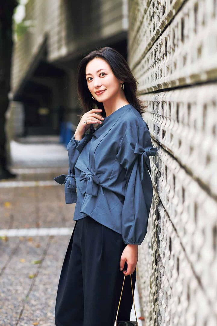 胸元と袖にあしらわれたリボンが目を引く主役級ブラウス。立体感のあるシルエットとくすみカラーが、モードとフェミニンを両得。黒パンツを合わせてすっきりまとめれば、オフィス後のディナーにも映える着こなしに。