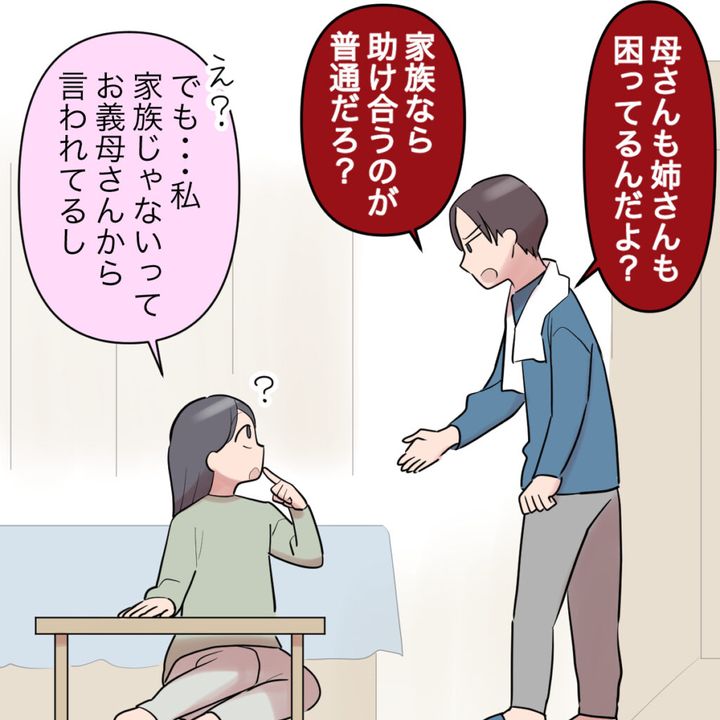 ユウタはそれでは引き下がらず、「母さんも姉さんも困ってるんだよ?家族なら助け合うのが普通だろ?」と言ってきました。私が家に入ってからずっと、悩んでも困ってもすぐ「あちら側」につき、私に我慢させてきたくせに。私はきょとんとした顔で「え?でも、私、家族じゃないってお義母さんから言われてるし」と、ここぞとばかりに義母に言われたひどい言葉を暴露しました。