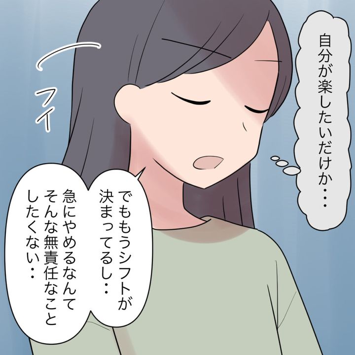 自分が楽をしたいだけの文句だと分かり、私はユウタの相手をするのも疲れてきました。「でももうシフトが決まってるし・・・急に辞めるなんて、そんな無責任なことしたくない」とだけ話してそっぽを向きました。