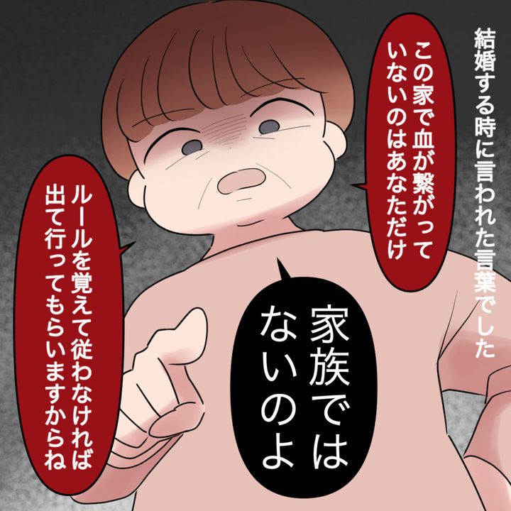 義母は授かり婚が決まった時に、怖い顔で「この家で血が繋がっていないのはあなただけ。家族ではないのよ。ルールを覚えて従わなければ出て行ってもらいますからね。」と怖い顔で宣言したのでした。当時は産まれてくる子のことを考えて、言われるがままにしてきてしまった私。でも今は違います。