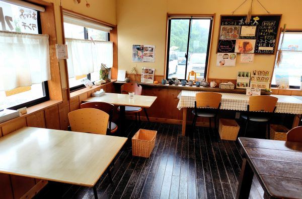 カフェの中は、木のぬくもりを感じる、ナチュラルで落ち着いた空間が広がっています。大きな窓の向こうには、のどかな田園風景。開放的な雰囲気の中で食事をいただけるなんて、贅沢。カウンター席やテーブル席がゆったりと配置され、一人でも友人や家族とでも、思い思いの時間を過ごせそうです。