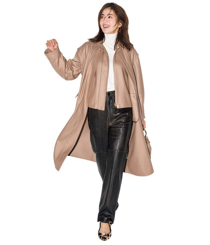 コート¥165,000ニット¥20,900(ともにエブール/リトルリーグ インク)パンツ¥26,400(HER.)バッグ¥269,500(ヴァレクストラ/ヴァレクストラ ジャパン)シューズ¥46,200(PIPPICHIC/ベイジュ)ピアス¥49,500(ブランイリス/ブランイリス トーキョー)