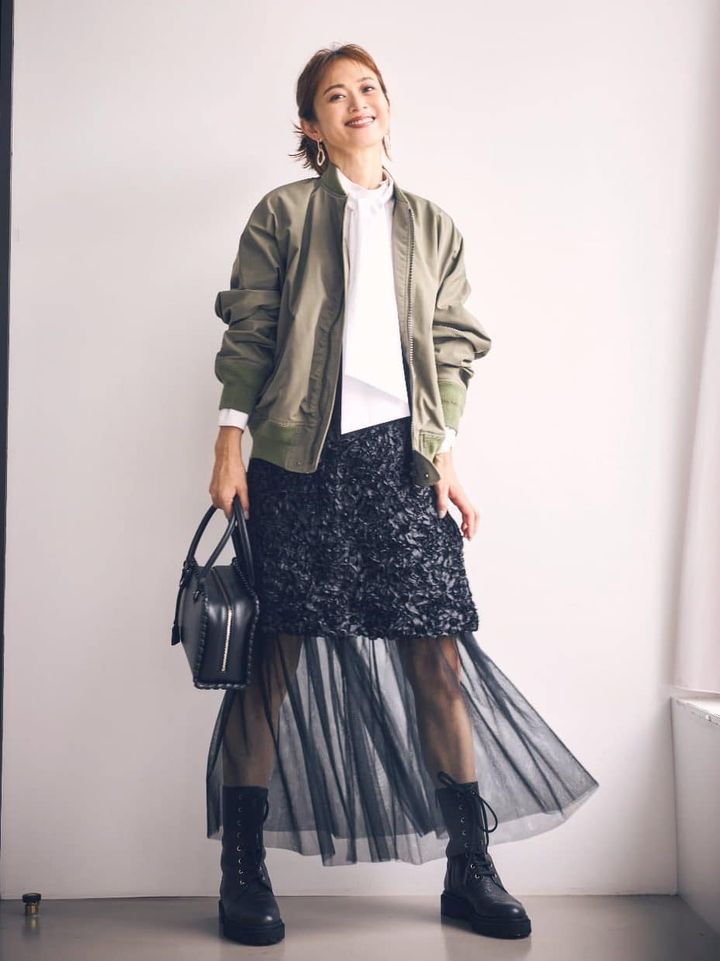 カーキブルゾン¥63,800(エンダレンス/ブランドニュース)ブラウス¥33,000(THIRD MAGAZINE)スカート¥88,000(ANAYI)バッグ¥92,400(メゾンヴァジック/ヴァジックジャパン)靴¥34,100(ダイアナ/ダイアナ 銀座本店)ピアス¥47,300(ブランイリス/ブランイリス トーキョー)