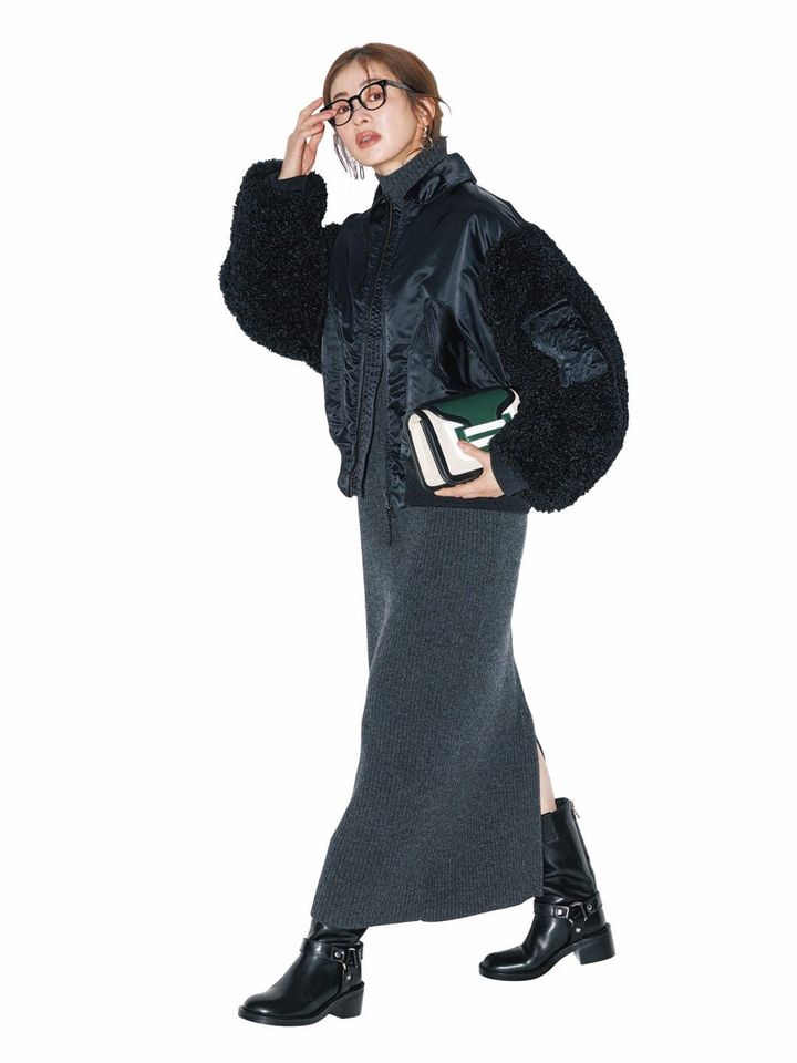 ブルゾン¥94,600(ハイク/ボウルズ)ワンピース¥53,900(サクラ/インターリブ)バッグ¥157,300(ピエール アルディ/ピエール アルディ 東京)ブーツ¥79,200(PIPPICHIC/ベイジュ)メガネ¥42,900(プロポ/プロポデザイン)ピアス¥30,800(ブランイリス/ブランイリス トーキョー)