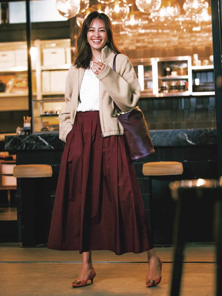 カシミアフリースブルゾン¥61,600(ロンハーマン/ロンハーマン)レースブラウス¥39,600(yori)スカート¥46,200(スタイリン/ユナイテッドアローズ 渋谷スクランブルスクエア店)バッグ¥322,300(トッズ/トッズ・ジャパン)パンプス¥79,200(ペリーコ/アマン)ピアス¥56,100リング¥49,500(ともにASAMIFUJIKAWA/ショールーム セッション)