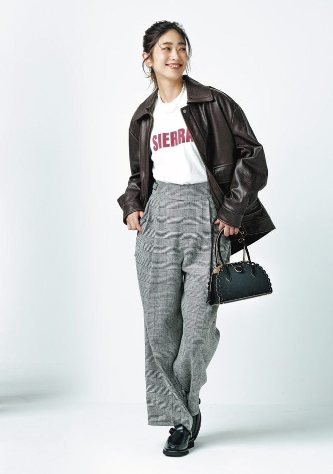 ジャケット¥231,000(ノア ハモア/ユナイテッドアローズ 麻布台ヒルズ ウィメンズストア)Tシャツ¥5,280(Mila Owen/Mila Owen ルミネ新宿2店)パンツ¥38,500(ウィム ガゼット/ウィム ガゼット 玉川髙島屋S・C店)バッグ¥42,900(メアリ オル ターナ/AL Design Inc.)ローファー¥83,600(ヘリュー/ギャルリー・ヴィー 丸の内店)ピアス¥39,600(ブランイリス/ブランイリス トーキョー)ネックレス¥13,200(Pearl for Life/ロードス)ソックス¥1,320(靴下屋/タビオ)