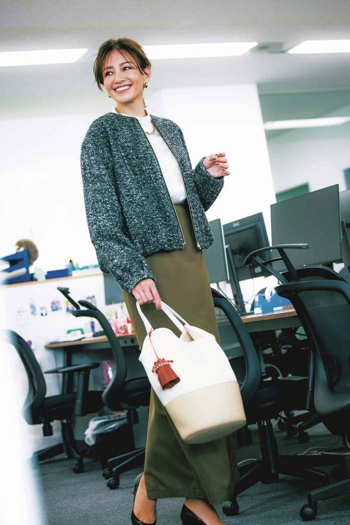 ツイードブルゾン¥49,400(23区/オンワード樫山)ブラウス¥31,900(サクラ/インターリブ)スカート¥24,970(イウエン マトフ/ユナイテッドアローズ 渋谷スクランブルスクエア店)バッグ¥165,000チャーム¥42,900(ともにJ&M デヴィッドソン/J&M デヴィッドソン カスタマセンター)パンプス¥19,800(オデット エ オディール/オデット エ オディール 新宿店)ピアス¥20,900ネックレス¥45,100(ともにローラロンバルディ/八木通商)