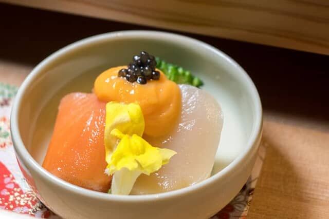 京都発祥と言われる手まり寿司。舞妓さんが口紅を崩さず、おちょぼ口で食べられるようひと口サイズで作られたと伝わります。前菜と共に「シグネチャーコース」に加わる手まり寿司は盛り付けも華やか。季節の食材も使われ、この日は鯛、鮪、車海老、縞鯵、帆立、烏賊、鯖、サーモン、鳥貝の9貫。酢飯も優しく、ネタの味を楽しむことができました。